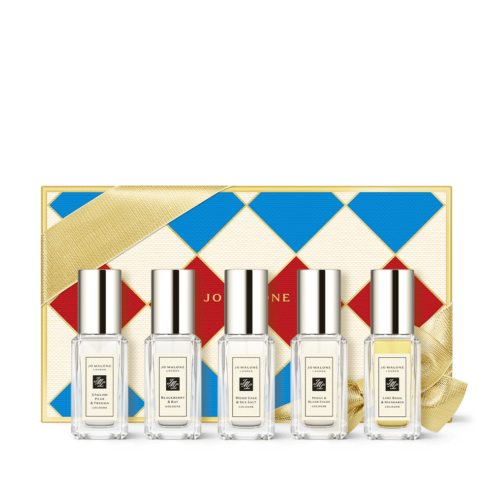 The gift of fragrance exploration. This festive gift box contains five timeless Jo Malone London colognes in 9ml bottles, including zesty Lime Basil & Mandarin, luscious English Pear & Freesia and fresh Wood Sage & Sea Salt. Each one can be worn individually or layered together for a festive match. This is not eligible for gift wrap.
